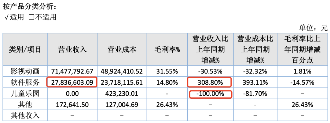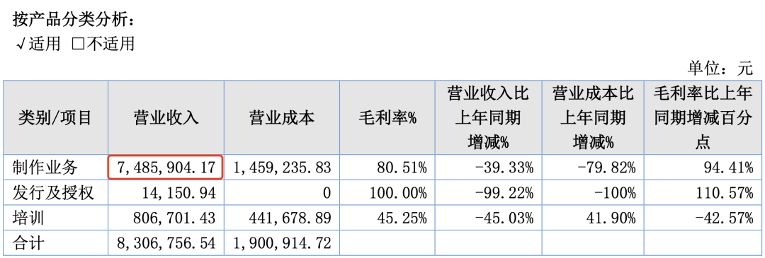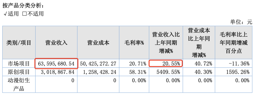 报告期内,动漫制作相关收入较上年增加,变动比例为26.14%。2022年随着疫情后实体经济的逐步恢复,同时公司承接了几个大型的新项目,动漫制作收入较2021年增加。近两年在动漫衍生品方面,为了更好的回归业主,围绕动漫设计服务现金流业务做大做强,战略转型,收缩产品线,暂时不再开发经营衍生产品。原创项目收入较上年增加5409.55%,主要原因是原创项目木奇灵4和黄麻烽火已完工结项,2022年产生授权收入301.89万元。