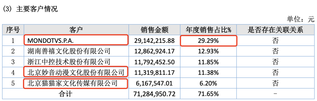 2022年,约克动漫来自海外的收入2959.6万元,同比减少58.91%,来自境内的收入6989.1万元,同比增加77.49%。其中,境外客户主要是MONODOTVS.P.A,销售收入2914.2万元,占比29.29%,此外,新三板另外一家挂牌公司妙音动漫也是约克动漫的五大客户之一,销售收入1132万元,占比11.38%,动画及潮玩公司ViViCat公司北京猫猫家也是约克动漫的客户,销售收入616.8万元,占比6.2%。