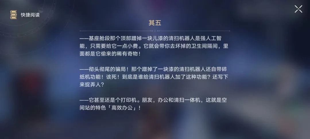 填充在游戏世界里的一些细节能够体现研发心血。比如《崩铁》拥有国产游戏罕有的庞大文本量,在新手关“黑铁空间站”里,随手就能捡到补充世界观的说明文档,包括《员工餐厅反馈记录表》《星域种植摘要》等五花八门的内容;玩家在游戏里能见到的第一组“商店”,是书店和卖报人,如果这还算国游无法摆脱的特色(毕竟其它有价值的商品得放在氪金商城),上线前就引起社区讨论、给都市“贝洛伯格”的每个垃圾桶都配上一段搞笑文案就不得不让人认同制作组确实用心了。