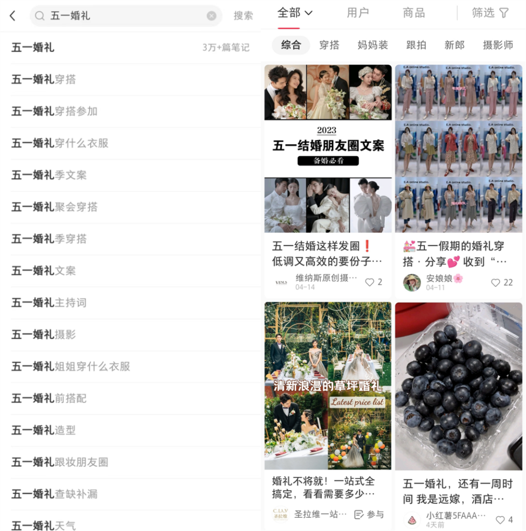 价值星球发现,在一家婚宴场地预定平台上,即时浏览人数高达5000人以上;小红书社交平台上,关于五一结婚的词条高达3万+,关于五一婚礼周边穿搭、摄影、文案、妆造的笔记更是不计其数。