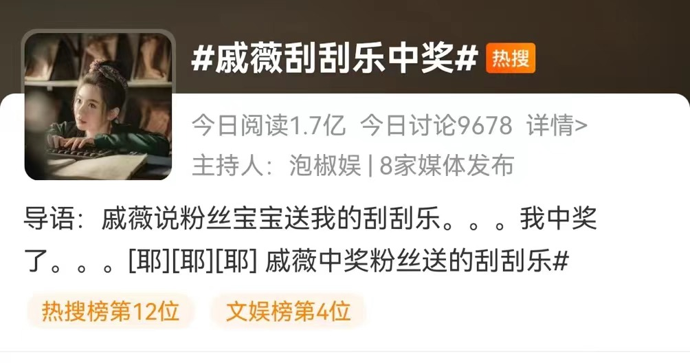 事实证明,“财神今天到我家”的朴素愿景能够击垮所有人在九年义务教育中习得的概率知识,并最终沉迷其中。譬如前几日,#戚薇刮刮乐中奖#的话题就一举登上了微博热搜,面对40万奖金的冲击,戚薇认真谨慎核对中奖号码的模样俨然就是无数个驻足彩票店年轻人的缩影。