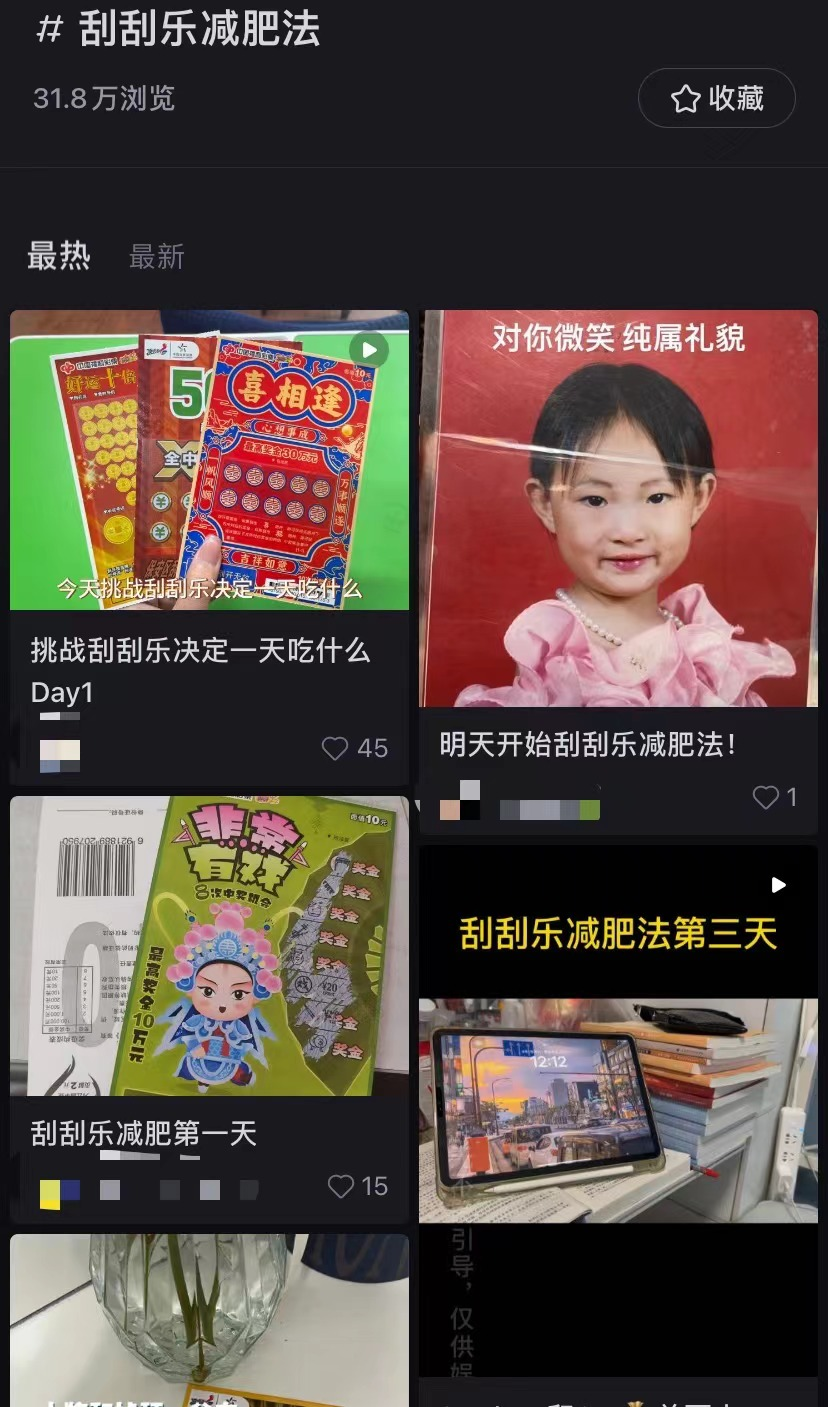 另一种博主则是围绕刮刮乐花样整活。95后的小红书博主花猫专门为了记录一个叫#刮刮乐减肥法#的活动注册了小红书,玩法是每天买三张刮刮乐,刮中多少就是饭钱,没中就当减肥了。