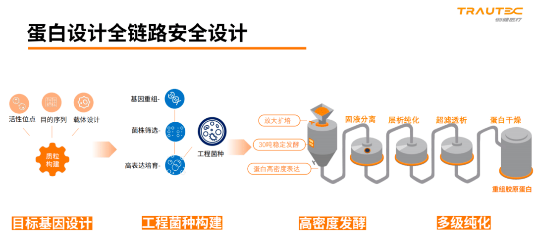 例如重组胶原蛋白底盘菌一般有三大主流:毕赤酵母菌、酿酒酵母菌和大肠杆菌,创健医疗就选择在毕赤酵母菌的基础上进行一系列蛋白全链路安全设计,包括目标基因设计、工程菌种构建、高密度发酵和多级纯化体系,以此保证原料产品的安全性。