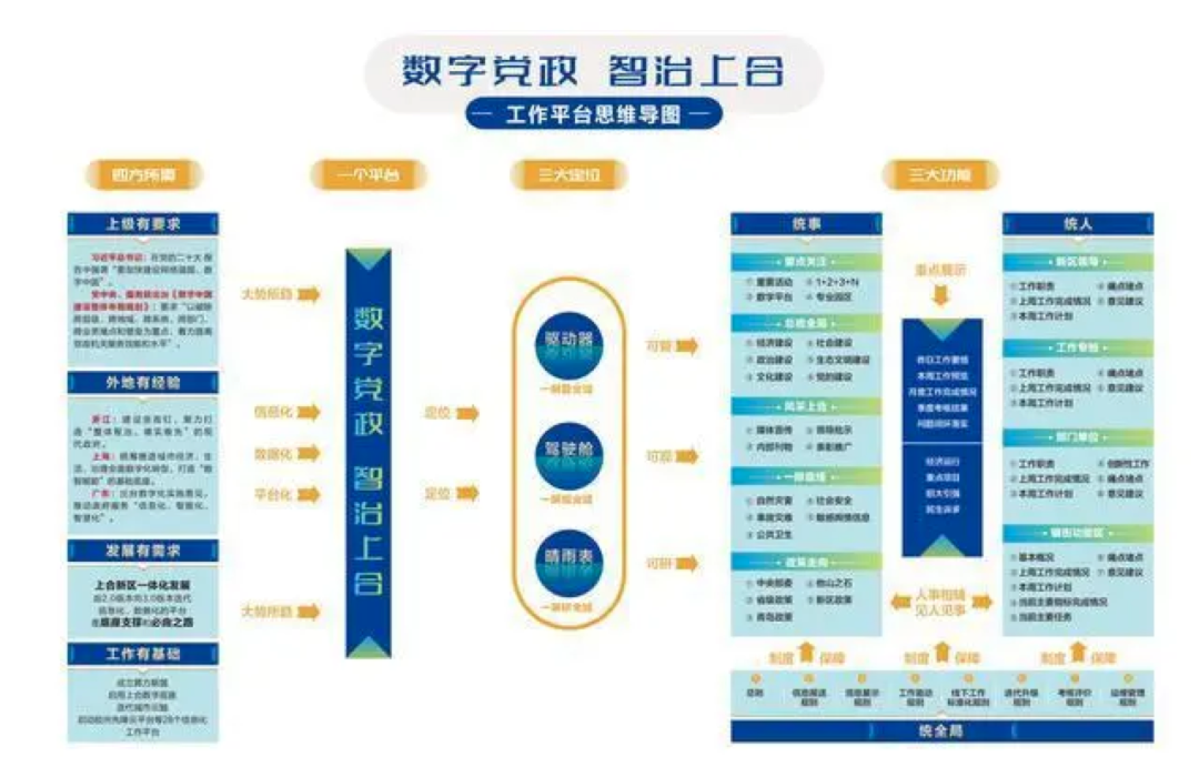 而今年2月上线的数字党政·智治上合工作平台,可以理解为一个跨部门之间的高效协作平台,依托大数据、数字孪生等技术手段,通过智治“驾驶舱”、工作“驱动器”、量化“晴雨表”三大功能,实现“一屏观全域”“一屏管全域” “一屏研全域”。