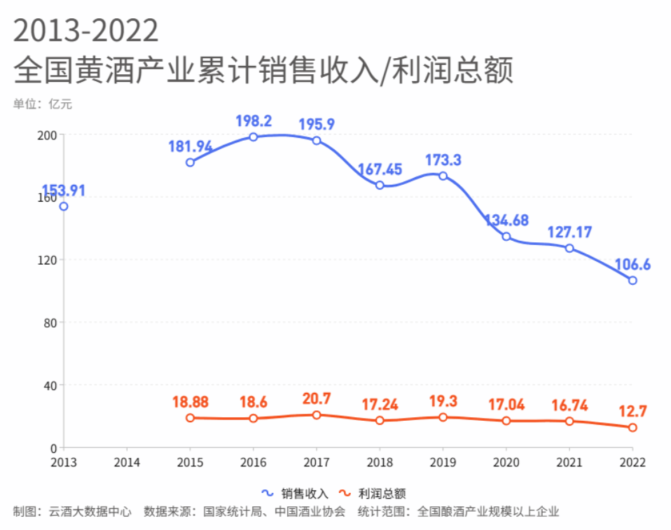 数据显示,2022年黄酒产业完成销售收入101.6亿元,同比下降20.1%;利润12.7亿元,同比下降24.3%。