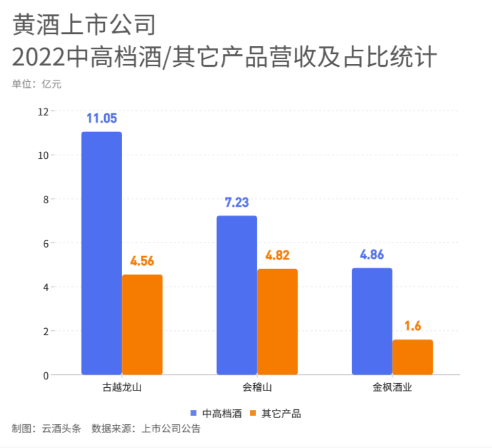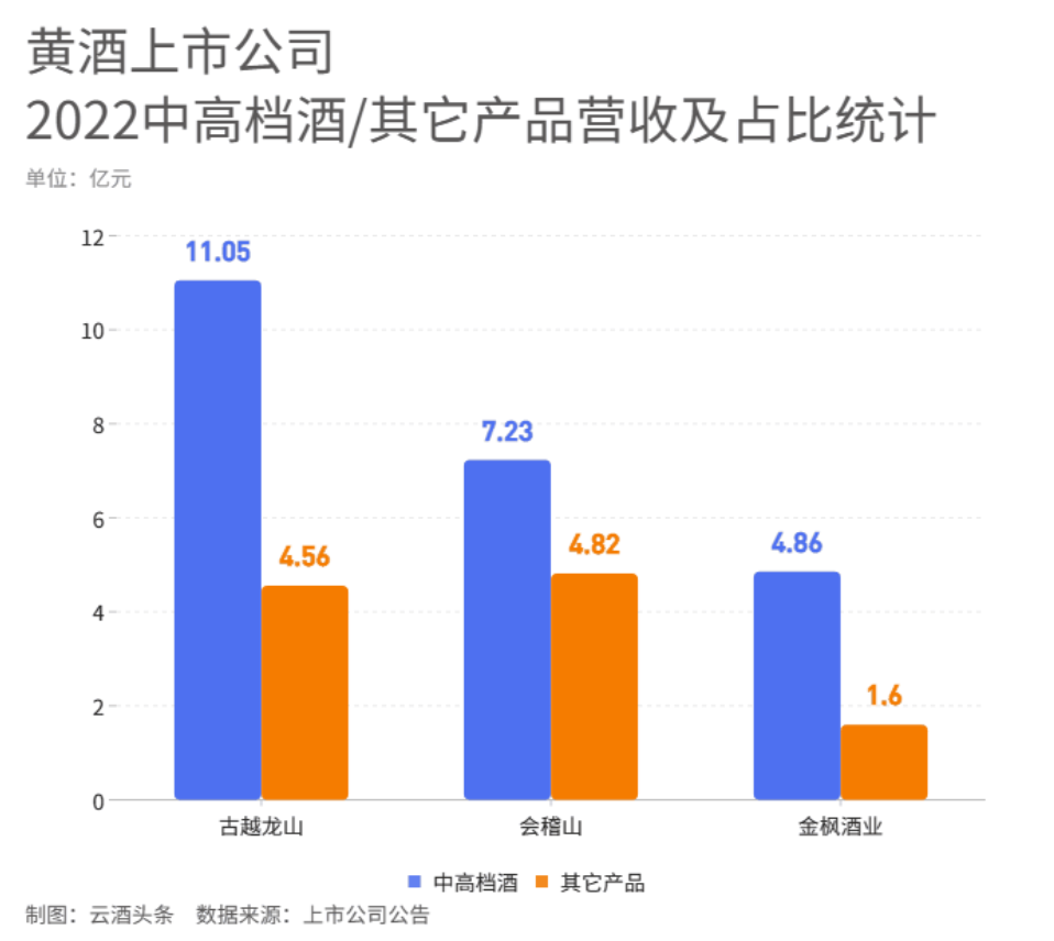 2022年,古越龙山中高档酒营收实现11.05亿元,占总营收的68.21%;会稽山中高档酒营收实现7.23亿元,占总营收的58.92%;金枫酒业中高档酒营收实现4.86亿元,占总营收的73.41%。
