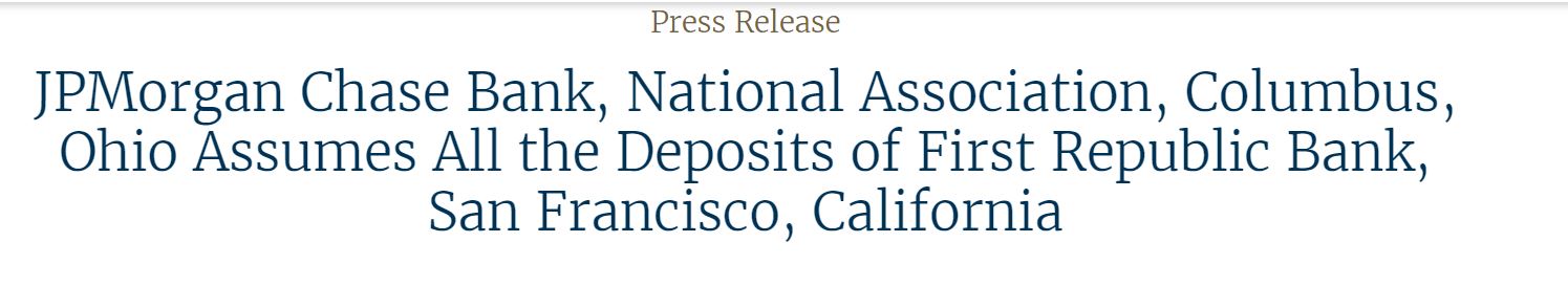 FDIC声明指出,周一营业时间开始后,第一共和银行在全美八个州的84个办事处将作为摩根大通的分行运行。第一共和银行的储户将成为摩根大通的储户,储户无需更换银行关系并可以完全动用此前的存款。