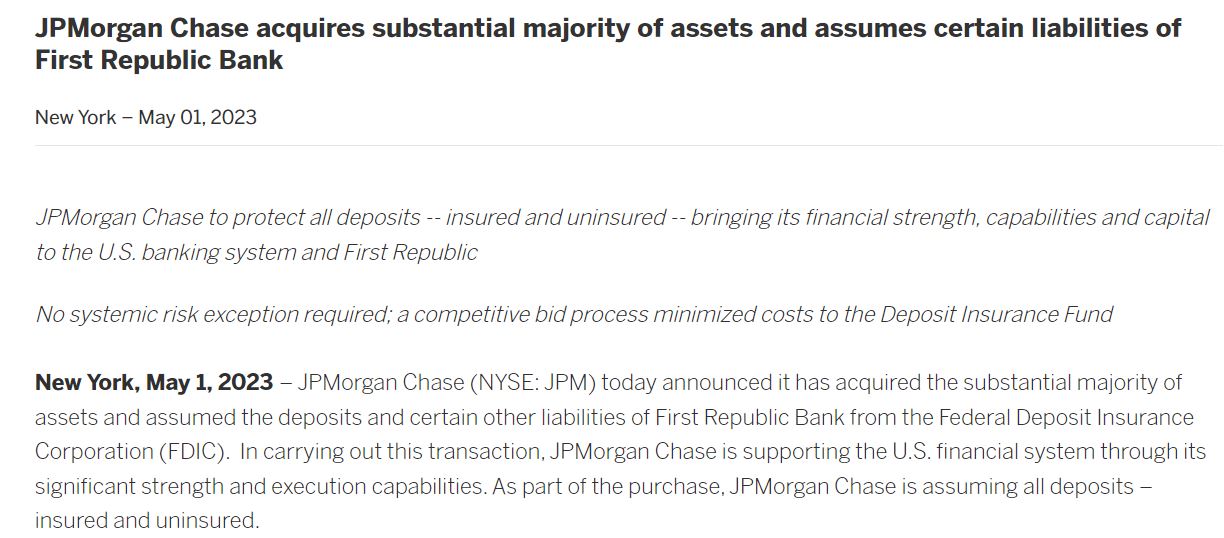 摩根大通首席执行官戴蒙(Jamie Dimon)称,政府邀请摩根大通和其他银行参与此次行动,摩根大通的收购帮助FDIC降低了存款保险基金的支付成本。在11家银行联手向第一共和银行存款时,戴蒙也是牵头人。