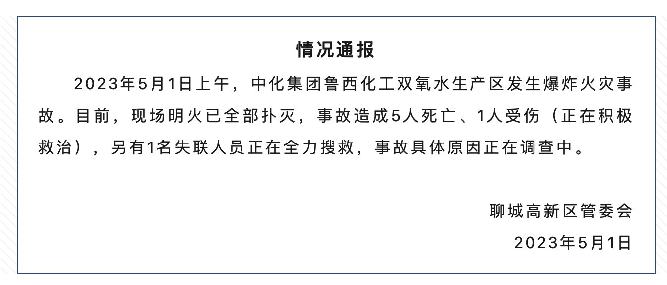 5月1日,山东聊城高新区管委会发布情况通报:2023年5月1日上午,中化集团鲁西化工双氧水生产区发生爆炸火灾事故。目前,现场明火已全部扑灭,事故造成5人死亡、1人受伤(正在积极救治),另有1名失联人员正在全力搜救,事故具体原因正在调查中。