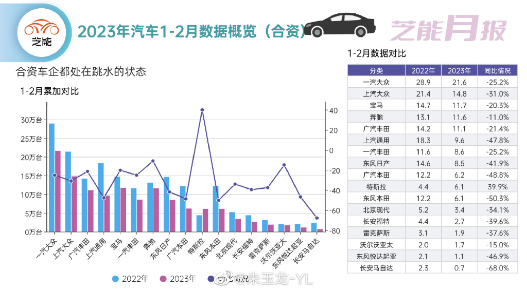 不仅本田承认落后,诸如丰田、大众、BBA( 奔驰宝马奥迪)、马自达、福特等众多外资品牌,都感受到了国产电动品牌的巨大竞争压力。2023年1-2月数据也显示,一汽和上汽大众同比销量下降25%以上,广汽本田和东风本田同比下降都在50%左右,销量同比下降最多的长安马自达,同比下降了68%。豪华品牌也不例外,诸如宝马同比降了20.3%,奔驰同比降了11%。