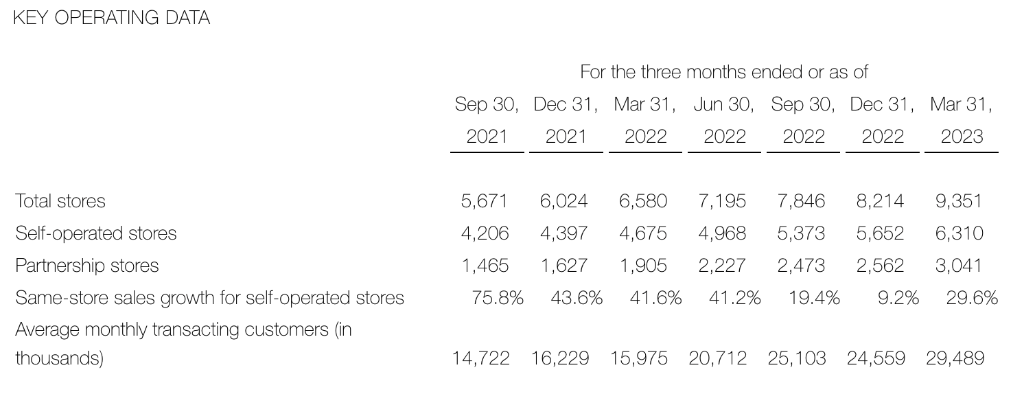 5月1日,瑞幸咖啡官网公布截至2023年3月31日三个月未经审计财务业绩。业绩显示,第一季度总净营收为44.367亿元,同比增长84.5%;净利润为5.648亿元,上年同期为1980万元;GAAP营业利润为6.784亿元,上年同期则为1610万元。此外,第一季度净新开店数为1137家。截至第一季度末,门店数量达到9351家,其中包括6310家自营店和3041家加盟店。