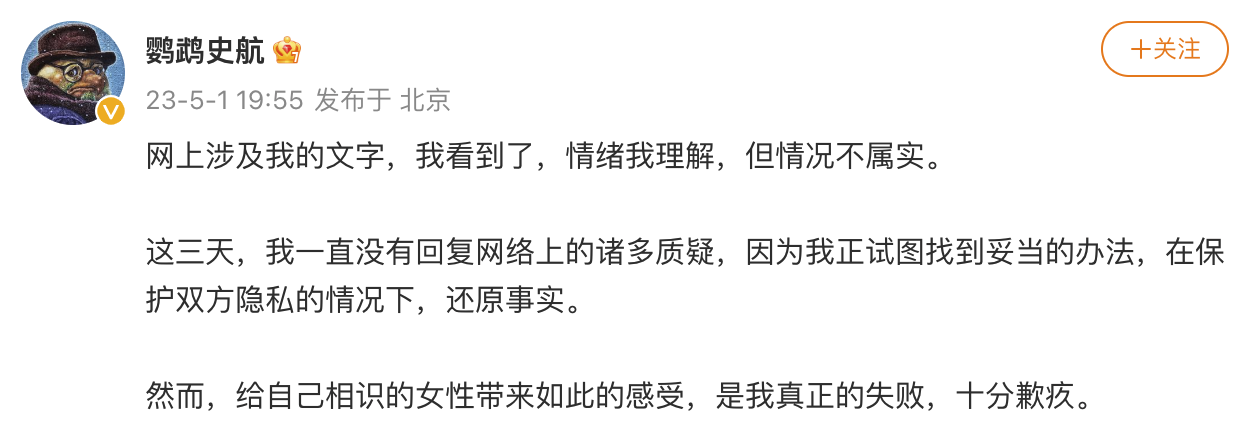 5月1日晚,编剧史航通过其个人微博发文回应涉嫌性骚扰指控。史航写道,“网上涉及我的文字,我看到了,情绪我理解,但情况不属实。这三天,我一直没有回复网络上的诸多质疑,因为我正试图找到妥当的办法,在保护双方隐私的情况下,还原事实。然而,给自己相识的女性带来如此的感受,是我真正的失败,十分歉疚。”