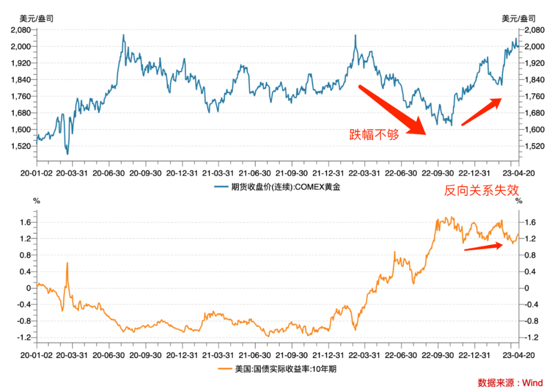 更特殊的是,在随后的2022年11月至12月,黄金价格已不只是抗跌,而是和实际利率走势开始显著同步——实际利率明显反弹,黄金本该下跌却依旧单边上行,两者从跷跷板几乎变成了并排跑。