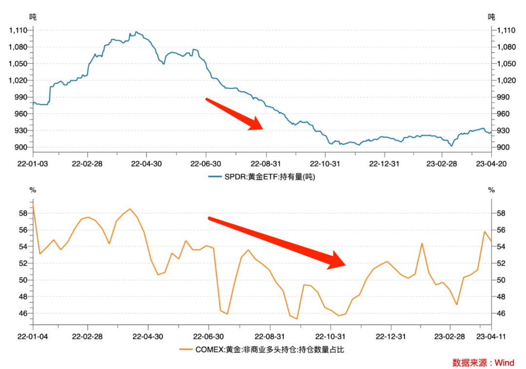 但这个猜想和现实并不相符,从真实的机构行为来看,机构投资人在2022年其实是看跌黄金的。从持仓比例上看,2022年无论是全球最大的黄金现货ETF,还是COMEX黄金期货非商业持仓多头占比,在 2022年都是下滑趋势。显示常规机构在持续减仓。