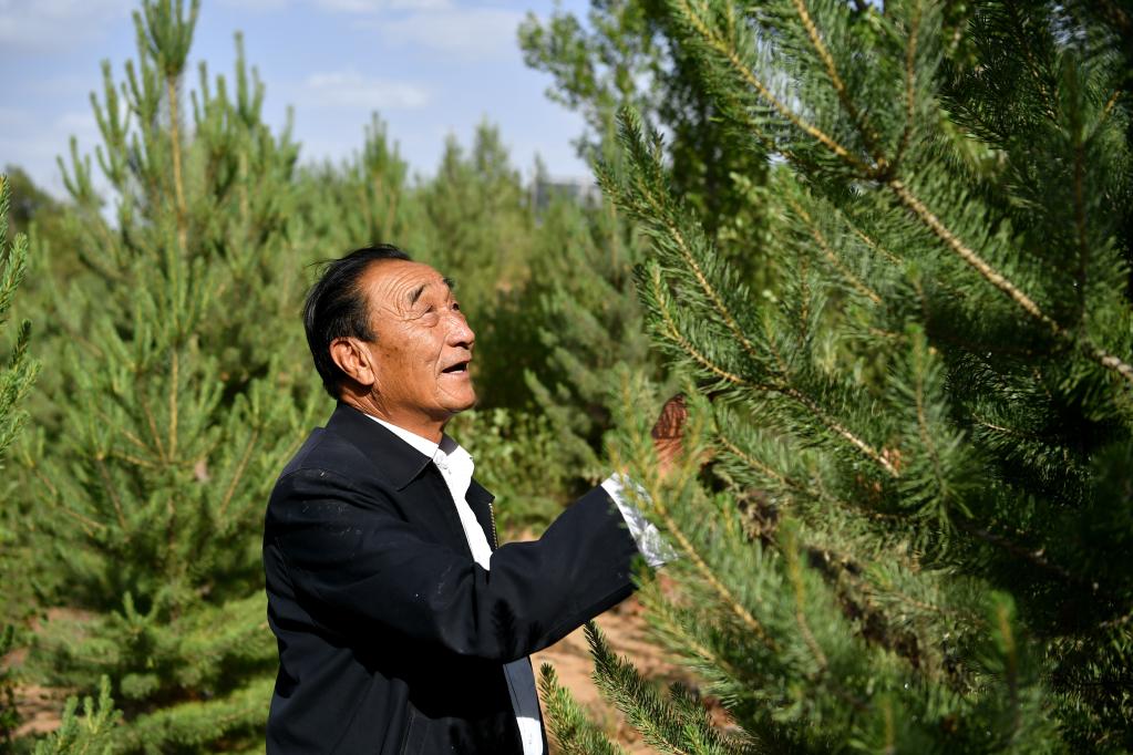 石光银在自己最早治理的“狼窝沙”林地里。新华社记者 刘潇 摄