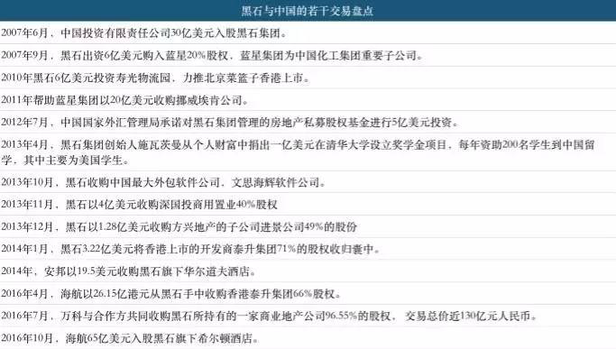 细追黑石与中资企业的交集,会发现包括万科、万达、恒大、安邦等大型民企和海航、中国化工、中投公司、华润等大型国有企业都曾与它有过交易。