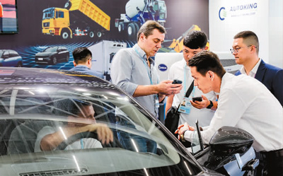 日前,外国采购商在广交会新设置的新能源及智能网联汽车展区了解中国新能源汽车产品。
