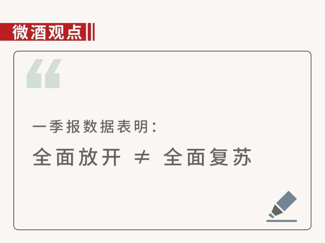 根据国家统计局数据,2023年 1-2 月社会消费品零售总额为 77067 亿元,同比增长3.5%,扭转了2022年 10 月以来连续三个月下降的趋势,在上年同期较高基数基础上持续恢复。白酒消费虽在这一阶段也明显回暖,但一季报数据显示:全面放开并不等同于全面复苏。