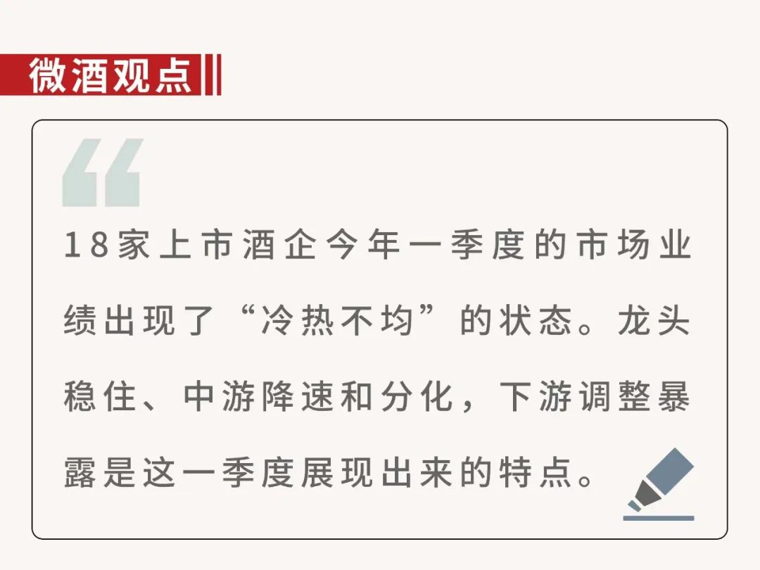 总体来看,18家上市酒企今年一季度的市场业绩出现了“冷热不均”的状态。龙头稳住、中游降速和分化,下游调整暴露是这一季度展现出来的特点。
