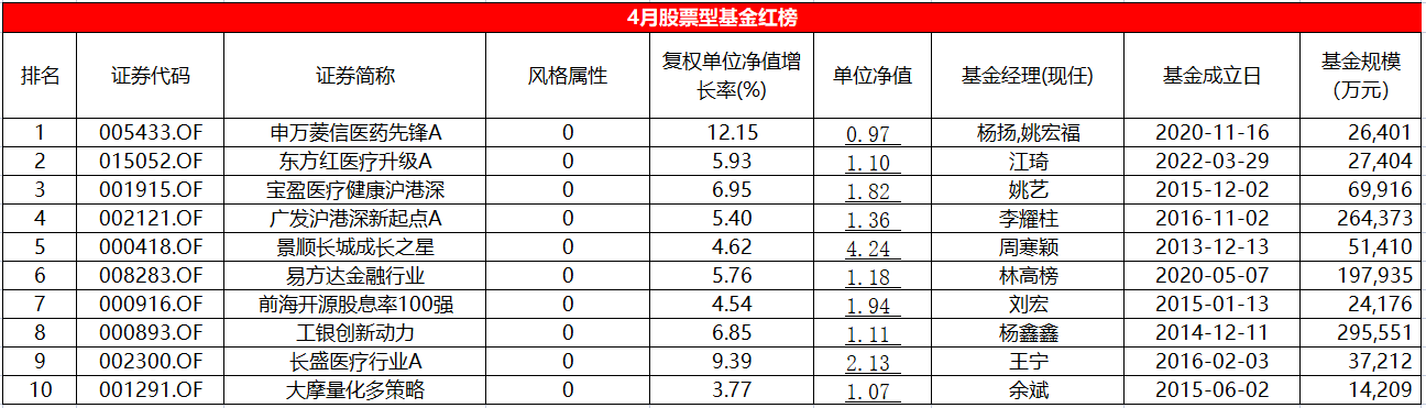 申万菱信医药先锋4月份收益率为12.15%,从持仓来看,一季度,该基金成功挖掘到了新华医疗(600587.SH)、山外山(688410.SH)、九强生物(300406.SZ)、奥瑞特(605116.SH)等多只市值在200亿元以下的小众股。以山外山为例,4月份股价从41元上涨至59.59元,涨幅达45.34%。