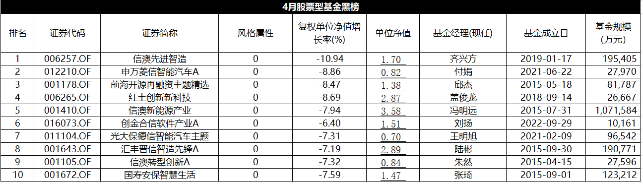 在黑榜的10只基金中,新能源主题基金占据多数席位。信澳先进智造4月份收益率为-10.94%,申万菱信智能汽车4月份收益率为-8.86%,信澳新能源产业4月份收益率为-7.94%。