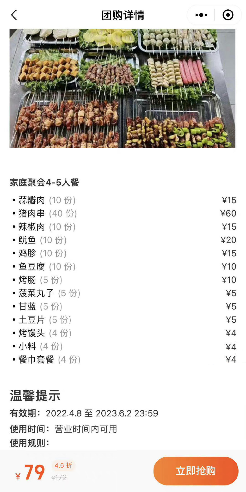 团购信息显示,一份4-5人份的烧烤套餐,只要79元。
