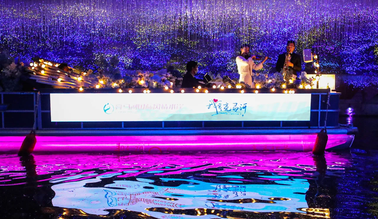在小红书搜索亮马河游船,10张封面里有8张是好运桥下的一片星星点点的蔚蓝——20万根光纤在水面倒映出梵高的《星空》,微漾的水波让油画“活”了起来。北京旅行博主刘必胜的笔记排在最热门的位置,在她的vlog中,芦苇和蒲草在随风摇曳,游船所过之处的每座桥都被装点成艺术装置,蓝色港湾变成仙气飘飘的欧洲小镇,河边餐厅和酒吧露天座位上的人们端起酒杯。刘必胜在旁白里分享自己的夜游体验:“北京虽有拥挤和喧嚣,有高昂的房价和生活成本,但她也有她的万种风情与活力”。