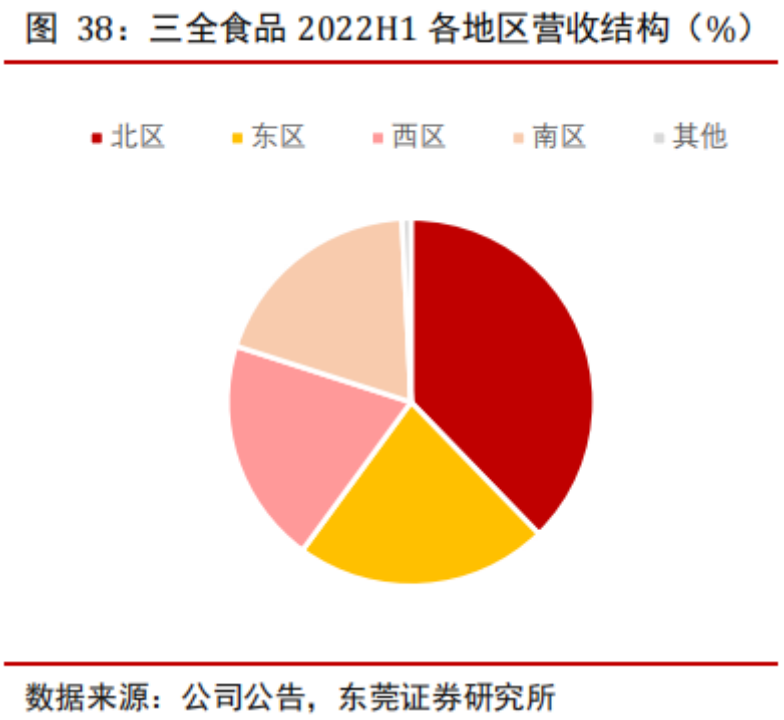 2022年上半年,三全北区的营收占比是37.74%,东区、吸取和南区分别是22.33%、19.86%和19.28%。