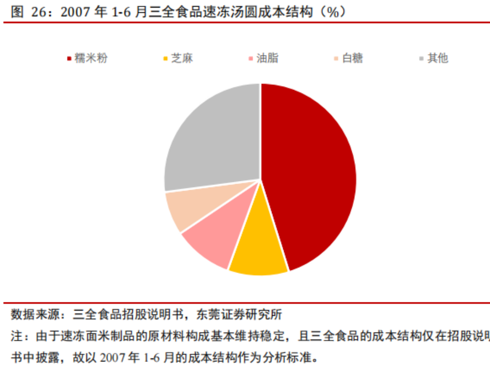 还有速冻汤圆,糯米粉占比最高,在45%上下。