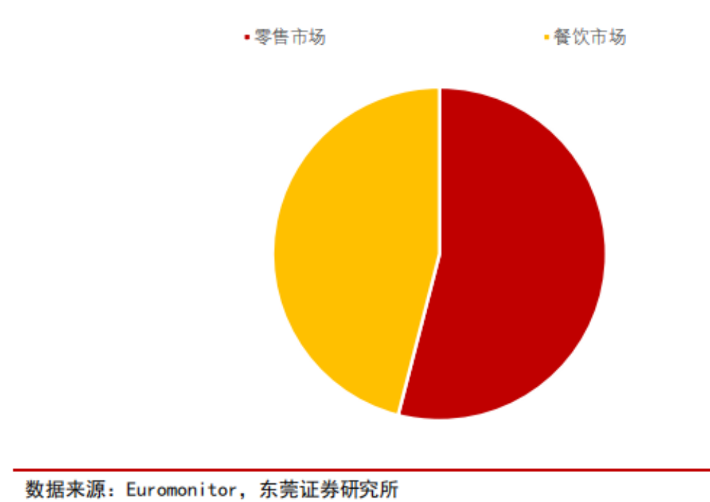 向C端销售的零售渠道占比是54%,餐饮渠道占比是46%上下。