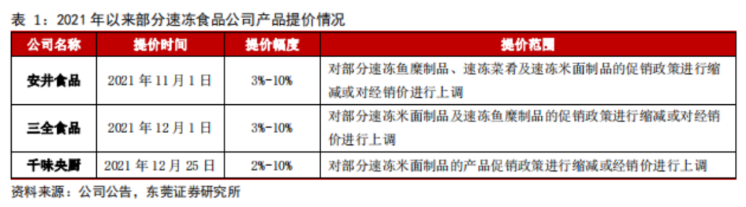 遇到原材料上涨的情况时,安井食品、三全食品和千味央厨等几家公司,会及时提价来应对原材料上涨的问题。