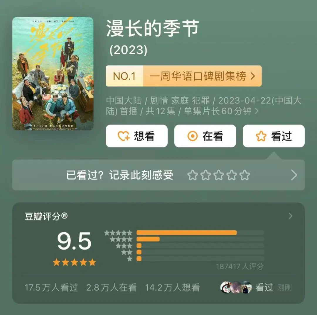 在豆瓣剧集评分榜上,几乎没有一部作品像《漫长的季节》一样,能够走出如此完美的口碑走势:以9.0分的超高评分炸裂开场,然后口碑稳步出圈,最后在会员收官阶段又以9.5分的成绩,提前预定2023年爆款席位,创造了罕见的高开炸走模式。