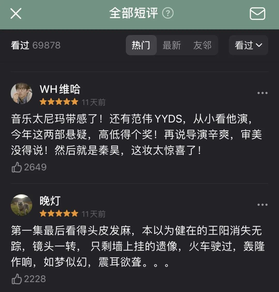 难怪豆瓣高赞的评论感慨:音乐太带感了!还有范伟YYDS,从小看他演,今年这两部悬疑,高低得个奖!再说导演辛爽,审美没得说!然后就是秦昊,这妆太惊喜了!可见观众的的眼睛还是善于发现精品,给予了这部剧最大的认可和尊重。