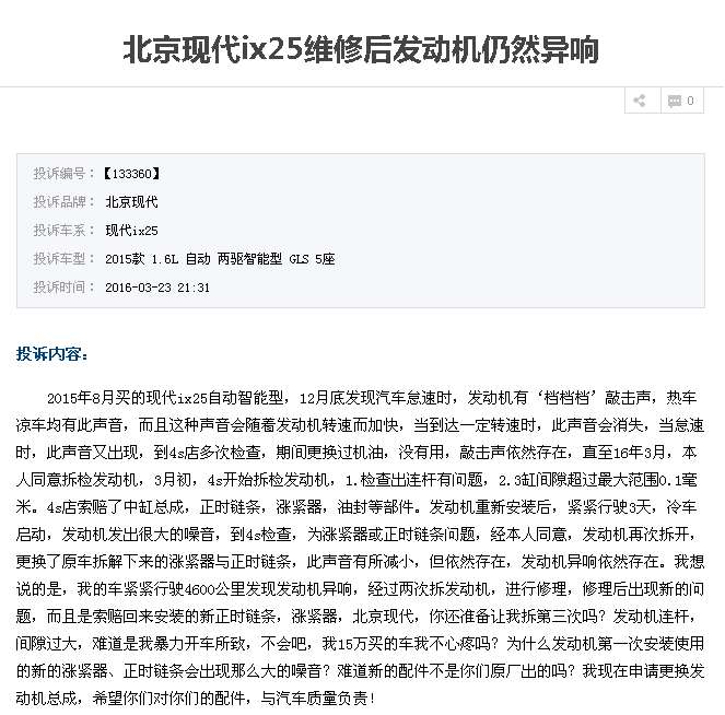这位车主在车质网上投诉称,他2015年8月买的2015款ix25自动挡车型,12月底的时候发现怠速时,发动机有“档档档”的敲击声,热车冷车都有此声音,并且声音随着发动机转速加快,达到一定转速时声音又会消失。经过多次维修,甚至拆了两次发动机,问题依旧没有解决。此声音有所减小,但发动机异响依然存在。车主希望更换发动机动力总成,要求北京现代对质量负责。