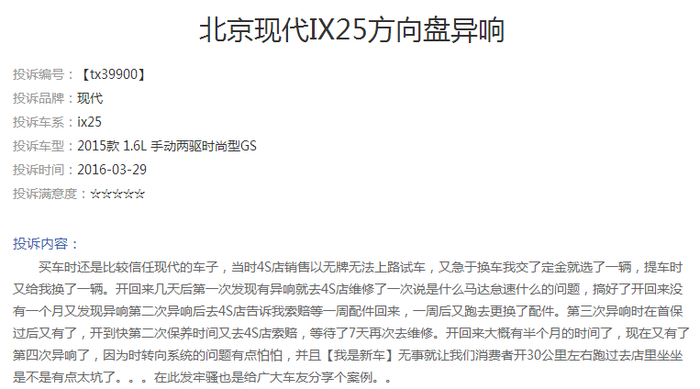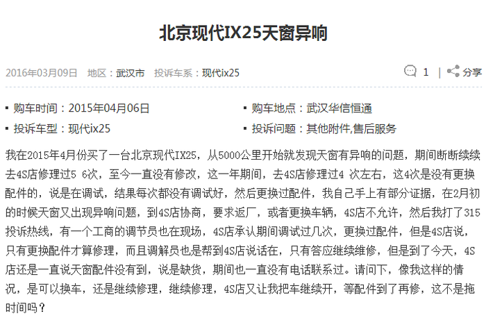 这位车主在中国汽车消费网上投诉称,他2015年4月买的车,行驶了5000公里就发现天窗有异响的问题。在修理店修理了5、6次,一直没有修好,车主为此甚至打了315投诉热线,有了换车的念头。