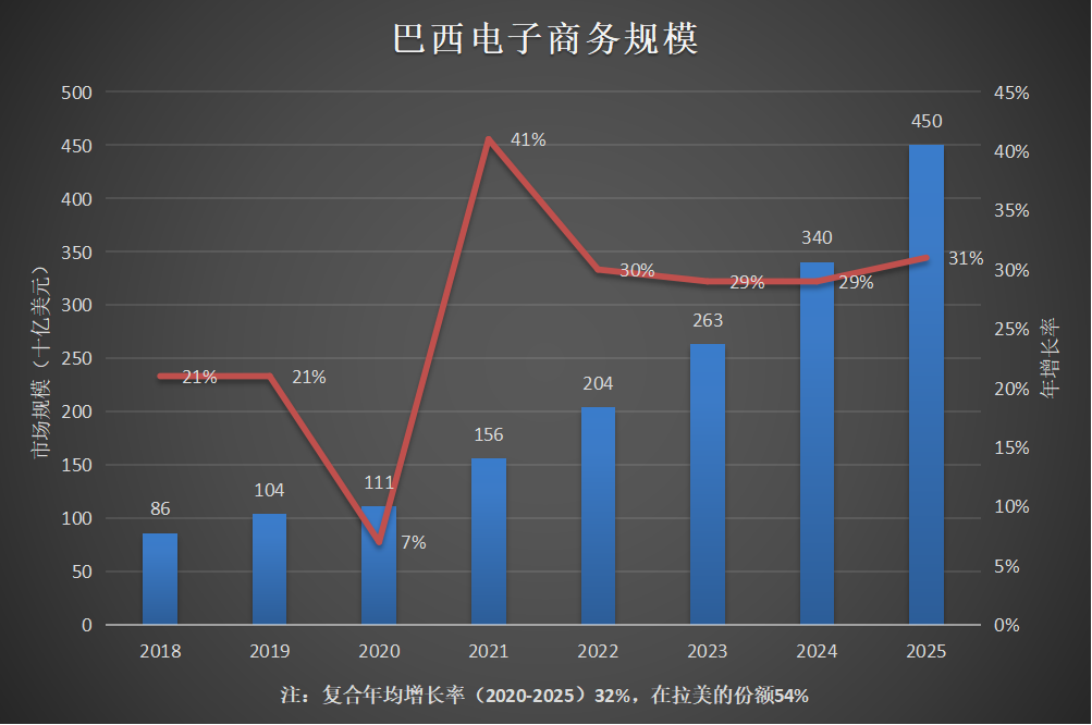 根据美洲市场情报(AMI)资料,巴西电商市场规模快速增长,从2020年至2025年的复合年均增长率高达32%,在整个拉美的份额占比约为54%