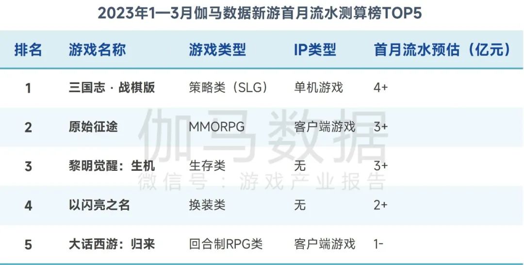 注:上述为2023年1—3月上线的移动游戏,并依据产品上线后30日国内全平台流水状况进行排名,上线不足30日的产品根据其目前流水状况推算首月流水。数据来源于伽马数据移动游戏流水测算,仅供参考。