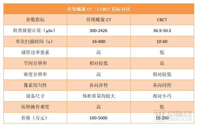 传统螺旋CT与CBCT指标对比(数据来源:公开资料整理)