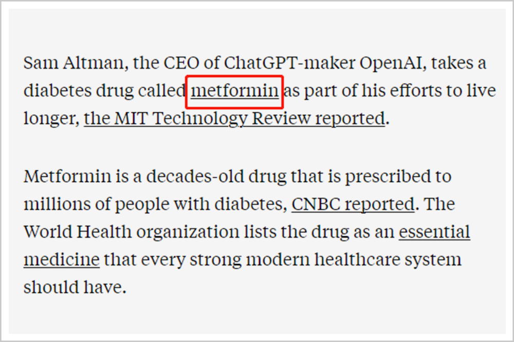 ▲2023年3月9日,《麻省理工科技评论》采访山姆·阿尔特曼时,他透露自己正在服用名叫二甲双胍(metformin)的糖尿病药物以延缓衰老