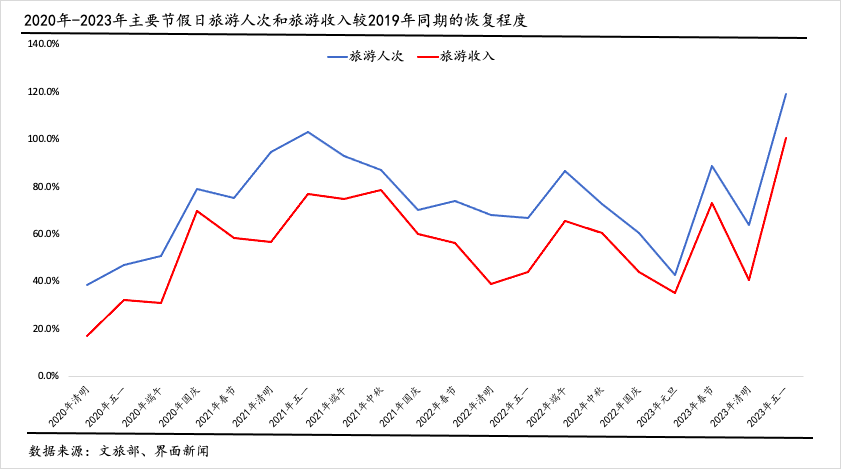 不过,仍要肯定的是,对比2020年以来的主要节假日较2019年同期的恢复率,今年“五一”假期旅游人次和收入的恢复程度均是最高的,特别是旅游收入是疫后首次超过2019年同期。