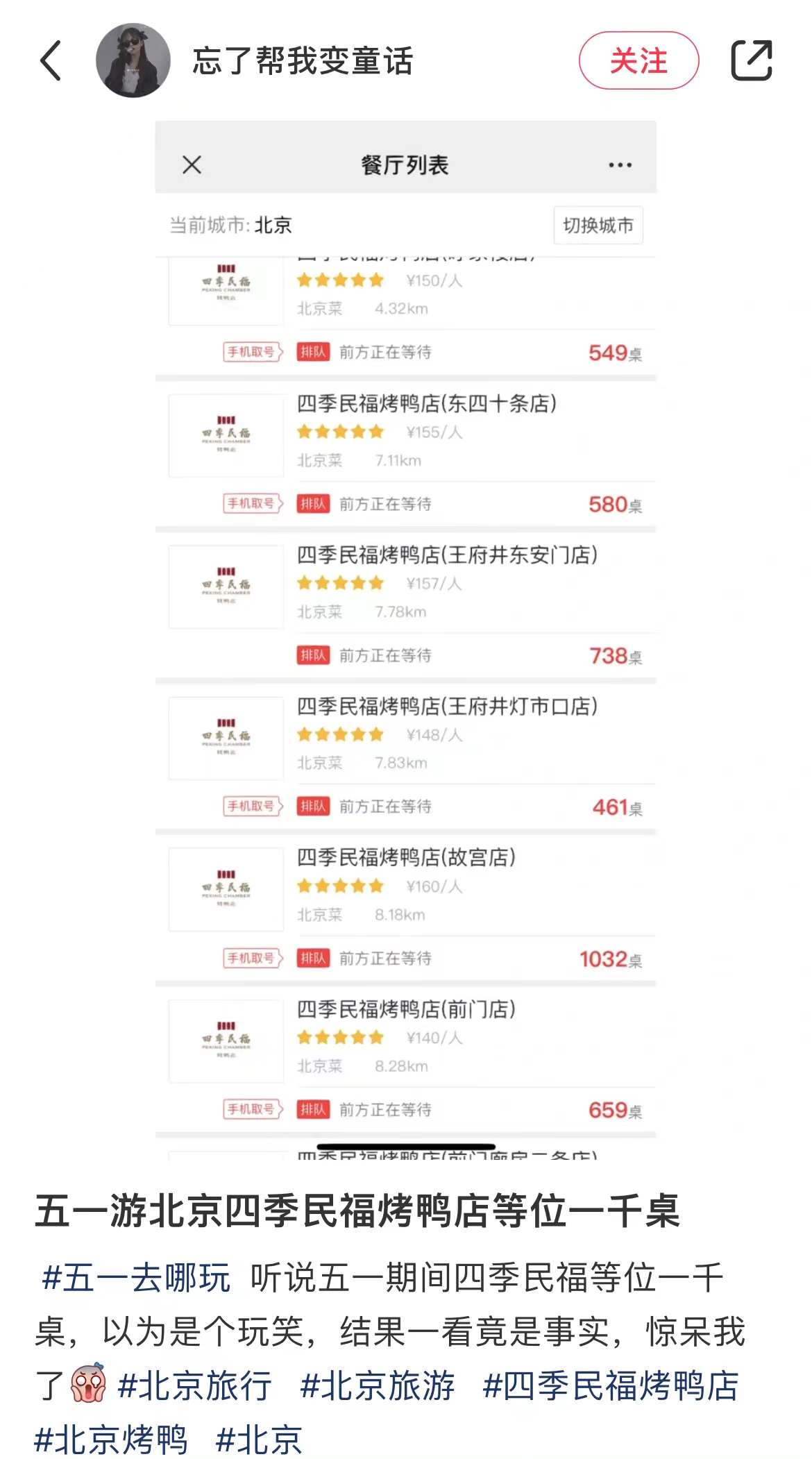 旅游热带动餐饮热同样成为五一小长假的趋势——在热门旅游目的地,部分餐厅重现排队等位超过1000桌的火热态势。