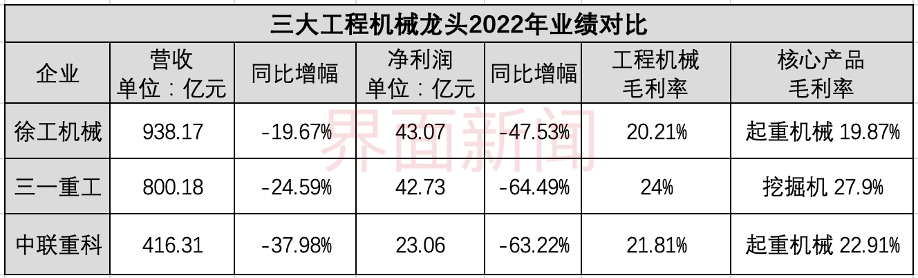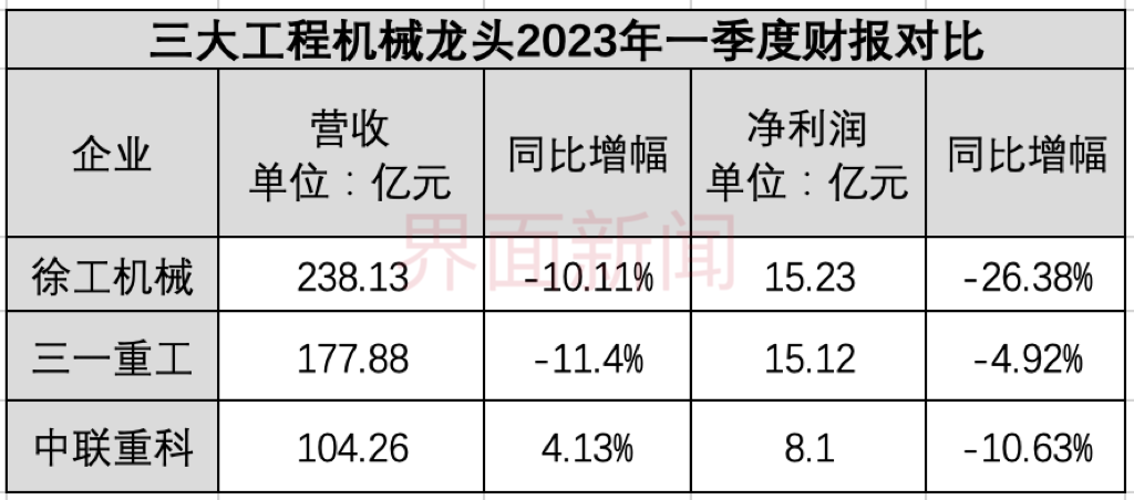今年一季度,三一重工单季净利润15.12亿元,同比微降4.92%;徐工机械同期净利润15.23亿元,下滑26.38%;中联重科营收迎来增长,达104.26亿元,净利下降约一成。