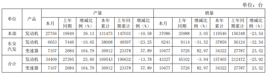 1-4月发动机合计销量157405台,同比下降25.92%,变速器合计销量34322台,同比增长23.52%。