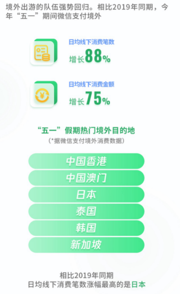 微信支付境外消费数据同样显示,五一假期热门境外目的地依次为中国香港、中国澳门、日本、泰国、韩国和新加坡。相比2019年同期,五一期间微信支付境外日均线下消费笔数增长88%,日均线下消费金额增长75%。其中,中国香港和中国澳门地区日均线下消费金额同比涨幅最大,为137%;日本日均线下消费笔数同比增长最多,增长了141%。