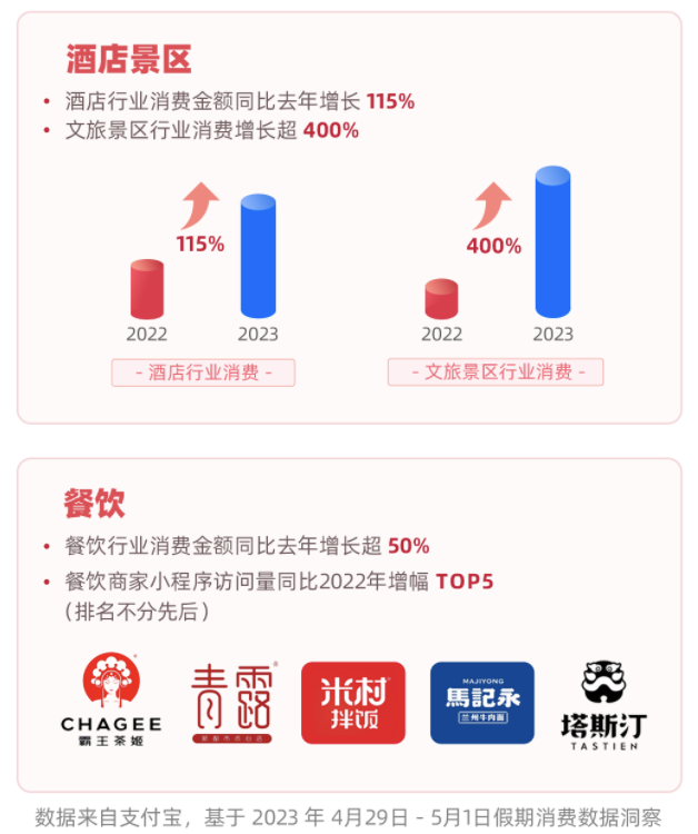 支付宝统计的五一假期前3天的消费洞察(4月29日-5月1日)数据显示,假期拉动了餐饮、出行、文旅行业消费热度的全面走高,假日支付笔数同比去年增长230%,消费金额同比去年增长200%,同比2019年则增长了70%。