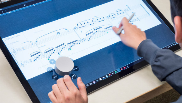 其实最炫酷的并非一体机的配置,而是与微软同期发布的辅助操控设备Dail搭配使用之后所呈现的功能。该设备配备手写笔,可以让用户完全抛开鼠标,进行非常精准的屏幕处理。此外还可以通过转动选择不同的操作种类,非常适合图像、视频以及设计工作者。