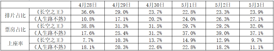 毒眸整理了从五一档前4月28日起,两部影片的排片占比、票房占比以及上座率的表现。不难发现,受预售的积极影响,上映首日,《长空之王》的排片与票房大幅领先《人生路不熟》。而正式进入档期之后,《人生路不熟》增长迅猛,档期第二天票房基本持平,从第三天开始实现排片与票房的反超。从上座率表现上来看,《长空之王》徘徊在7%-15%之间,而《人生路不熟》除最后一天之外持续保持在18%以上。