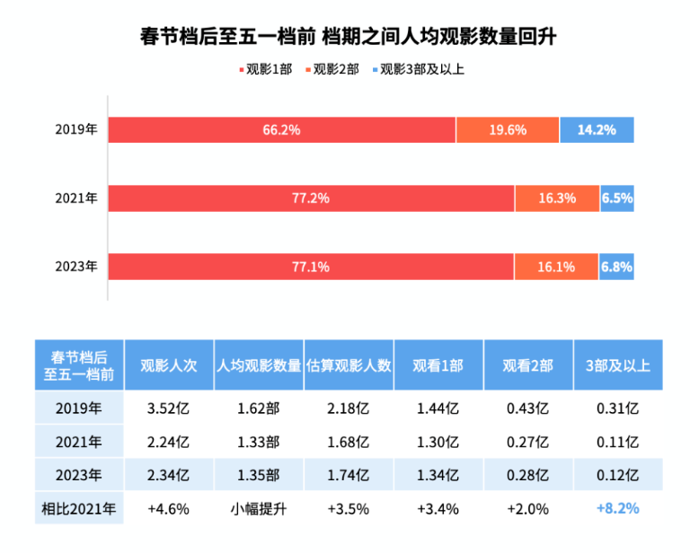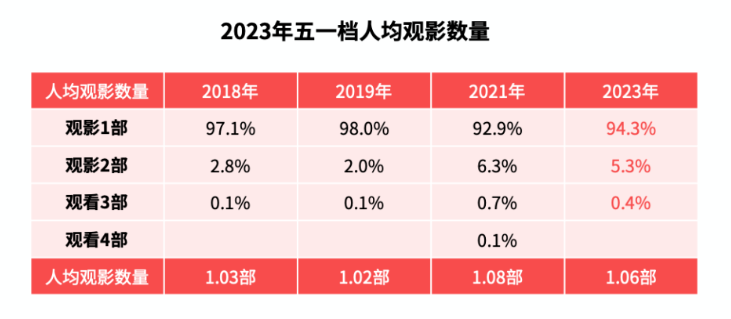 很重要的原因在于,在几乎所有档期中,大部分观众均只选择一部影片观看。据猫眼《2023年五一档数据洞察》显示,从2018年仅有3天的五一档,到2023年有5天的五一档,只看一部影片观众占比尽管有所下降,但也维持在94%以上,人均观影数量也仅仅只从1.03部提升到了1.06部。