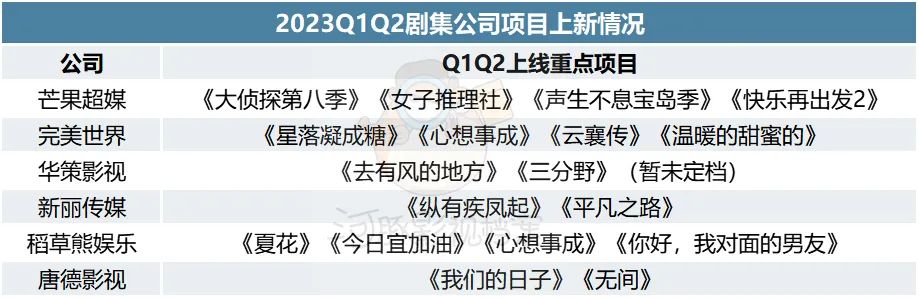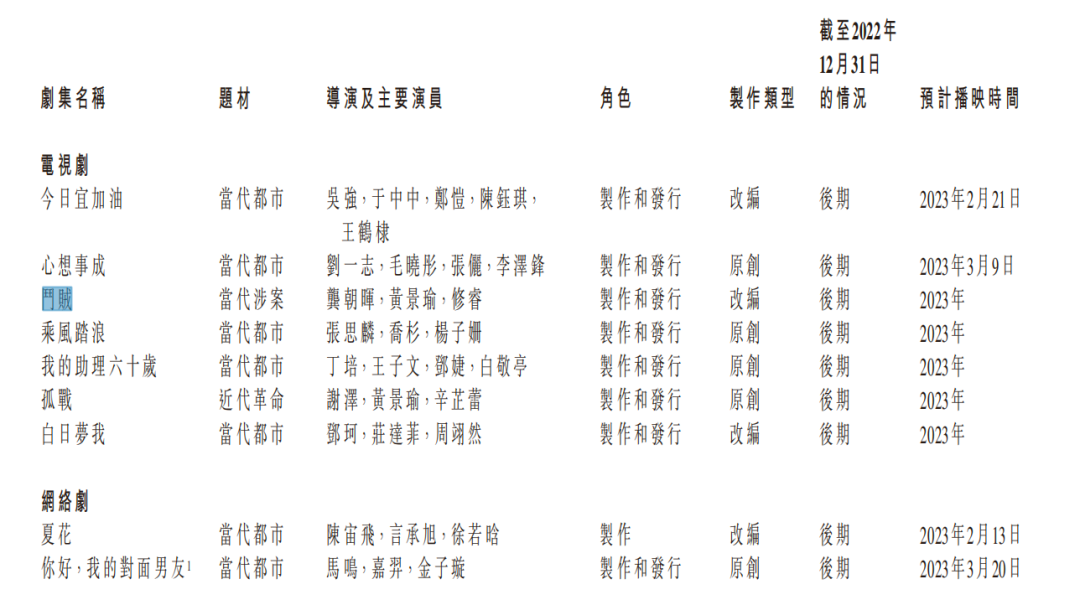 但随着疫情放开,公司的产能已经在逐渐恢复。2023年Q1就有《夏花》《今日宜加油》《心想事成》《你好,我对面的男友》四部剧集播出。《斗贼》《乘风踏浪》等作品,也已进入制作或发行阶段。