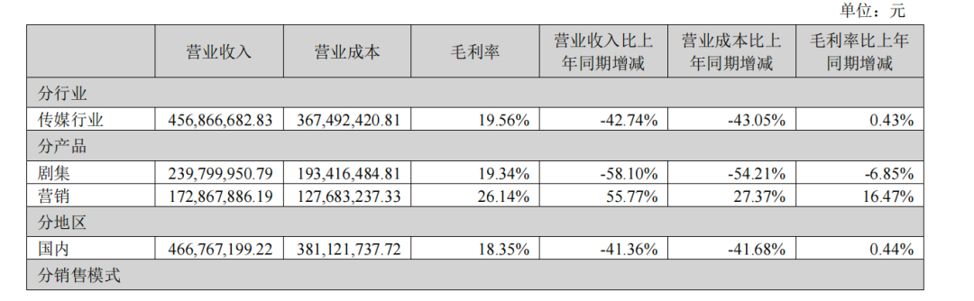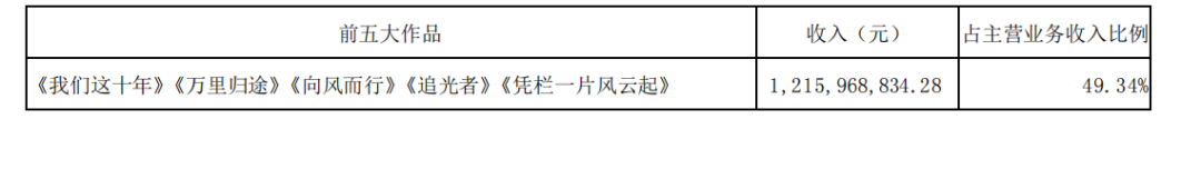其中,电视剧制作、版权发行收入分别为15.27亿、3.41亿,《我们这十年》《万里归途》《向风而行》《追光者》《凭栏一片风云起》五部作品,带来近50% 的主营业务收入。